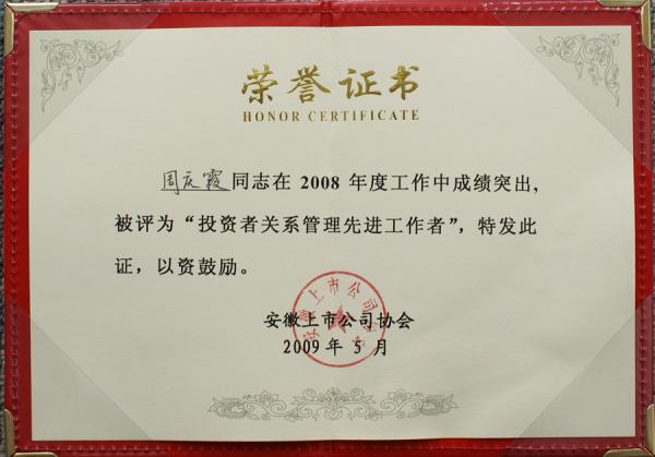 近期,在刚刚结束的安徽省上市公司协会年会上,皖能股份公司荣获“2008年度投资者关系管理先进单位”,公司董事会秘书周庆霞女士被评为“安徽省2008年度投资者关系管理先进工作者”光荣称号。这充分肯定了皖能股份公司08年度在投资者关系管理方面所做的工作。