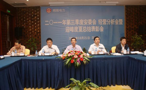 10月21日,皖能股份公司在马鞍山市召开2011年第三季度安委会、经营分析会暨迎峰度夏总结表彰会。集团公司党委副书记、纪委书记张海平,股份公司领导、各部门主任,各发电企业、电力燃料公司、电力运营检修公司、环保公司的有关负责同志等参加会议。