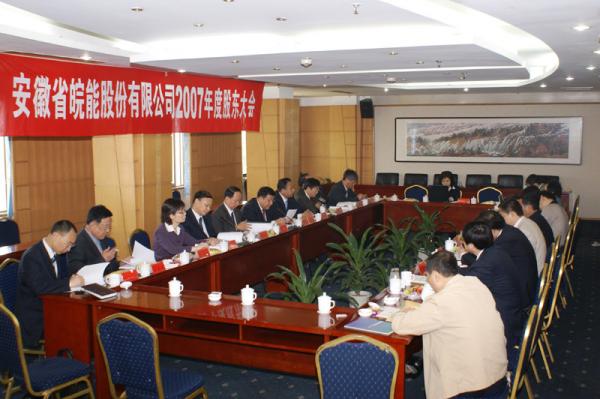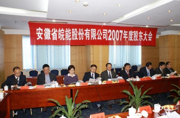 皖能电力2007年度股东大会于2008年4月29日上午九点在皖能大厦四楼五号会议室召开。出席会议的股东和股东代表6人,代表有效表决权509,308,704股,占公司现有总股本773,008,816股的65.89%。大会由董事会召集,董事长方平先生主持;公司董事会、监事会和高管人员出席会议;会议安泰达律师事务所李荣律师现场见证。