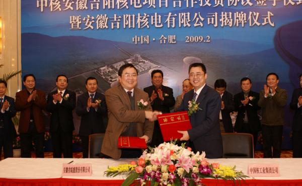 2月25日上午,稻香楼宾馆宴会厅充满着节日般喜庆的气氛。安徽吉阳核电项目合作投资协议签字暨项目公司揭牌仪式在这里隆重举行。中核集团副总经理余剑锋、省发改委主任沈卫国、池州市委书记童怀伟、市长方西屏、集团公司党委书记、总经理白泰平、集团公司副总经理、股份公司总经理吴优福等领导参加了签字暨项目揭牌仪式。