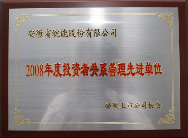 近期,在刚刚结束的安徽省上市公司协会年会上,皖能股份公司荣获“2008年度投资者关系管理先进单位”,公司董事会秘书周庆霞女士被评为“安徽省2008年度投资者关系管理先进工作者”光荣称号。这充分肯定了皖能股份公司08年度在投资者关系管理方面所做的工作。