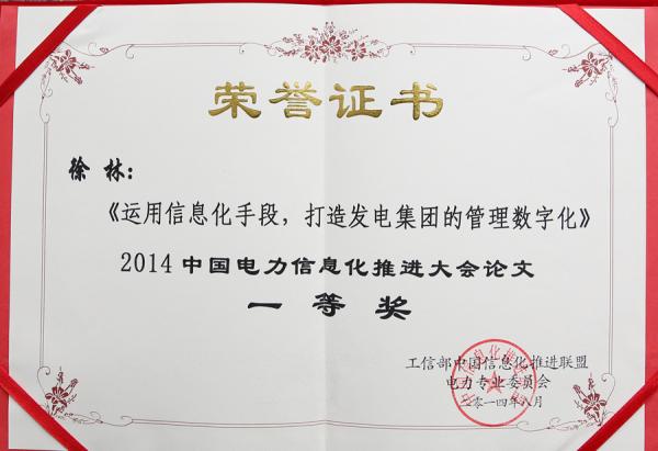 8月下旬,在工信部中国信息化推进联盟举行的全国优秀电力信息化论文颁奖仪式上,皖能股份公司徐林同志撰写的《运用信息化手段,打造发电集团的管理数字化》被评为2014年度全国优秀电力信息化论文一等奖。本次活动有来自全国371家单位投稿,设立一等奖3名,二等奖10名,三等奖20名。